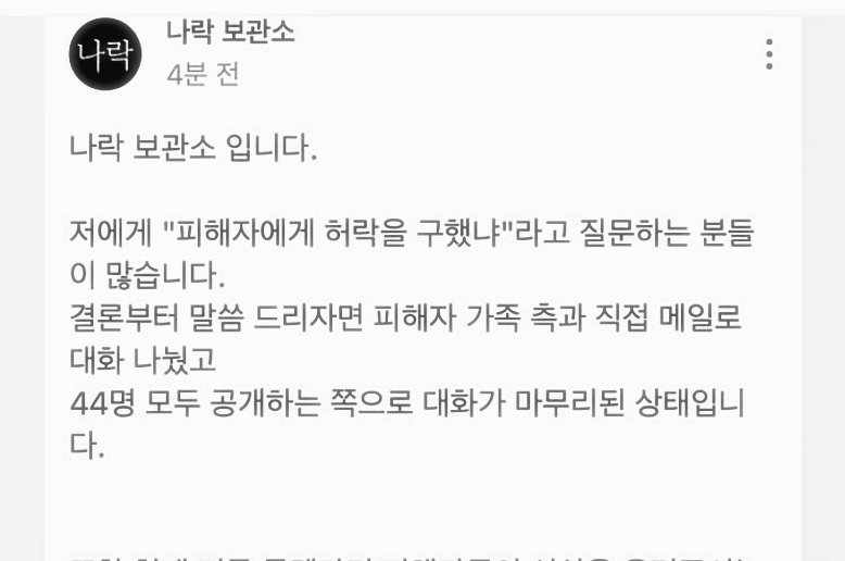 나락보관소는 피해자와 소통하여 신상 공개에 대한 동의를 받았다고 주장했으나, 한국성폭력상담소는 이를 부인하며 "피해자와의 소통이 전혀 없었다"고 밝혔습니다. 상담소는 피해자들의 요청이 무시되었으며, 나락보관소의 일방적인 행태에 대해 강하게 비판했습니다. 피해자와 가족들은 나락보관소가 피해자의 의사를 반영하지 않은 채 신상을 공개한 점에서 큰 상처를 입었습니다.