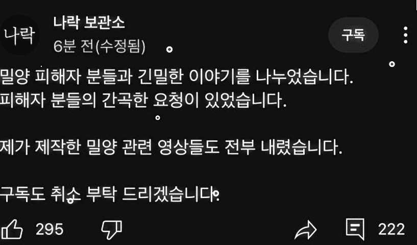 최근 유튜브 채널 '나락보관소'는 밀양 성폭행 사건 가해자들의 신상 정보를 공개하며 큰 논란을 일으켰고, 그 결과로 채널이 삭제되는 사태에 이르렀습니다. 이 사건은 신상 공개의 윤리적 문제와 사적 제재의 부작용을 둘러싼 사회적 논쟁을 불러일으켰습니다.